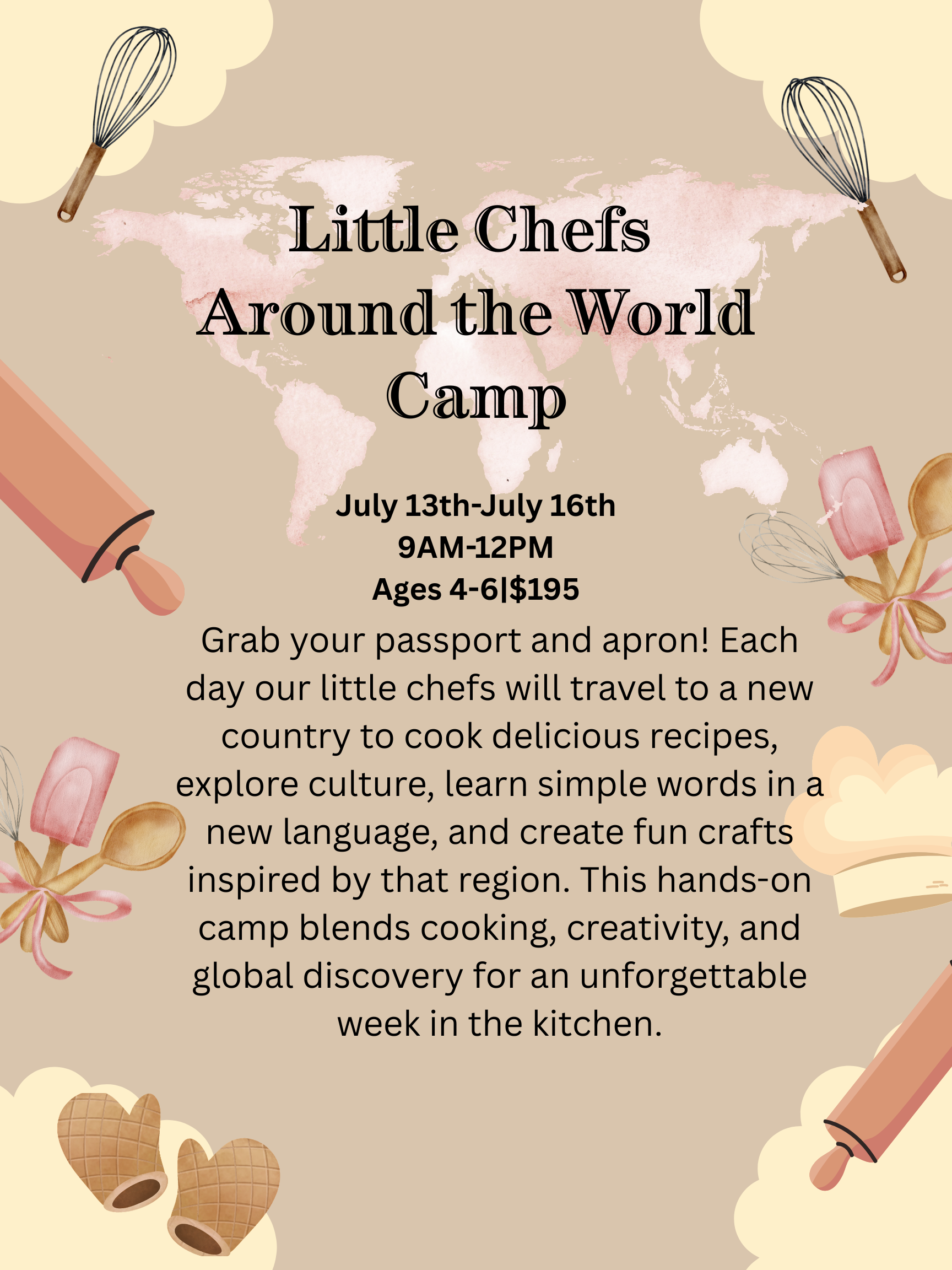 Each day we will explore a different country as children cook a simple recipe inspired by that region, create themed crafts, and learn about the traditions, language, and culture that make each place unique. From mixing and measuring to tasting and creating, campers will build confidence in the kitchen while discovering how food connects us around the world.